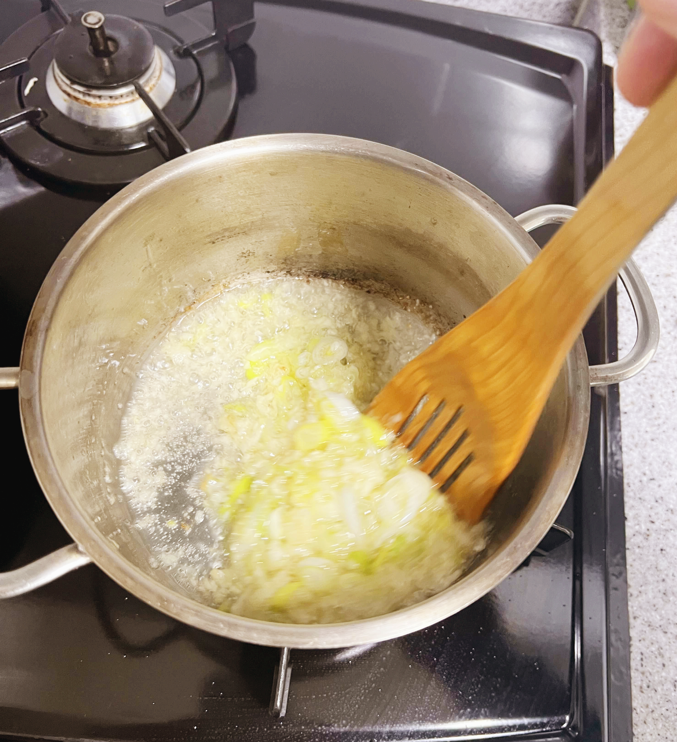 우선 기름을 조금 넉넉하게 넣은 다음 대파와 마늘을 때려넣고 볶아준다. 파랑 마늘이 기름에 충분히 녹아들었을 때 즈음에 라면 스프를 넣고 게속 볶아 준다.