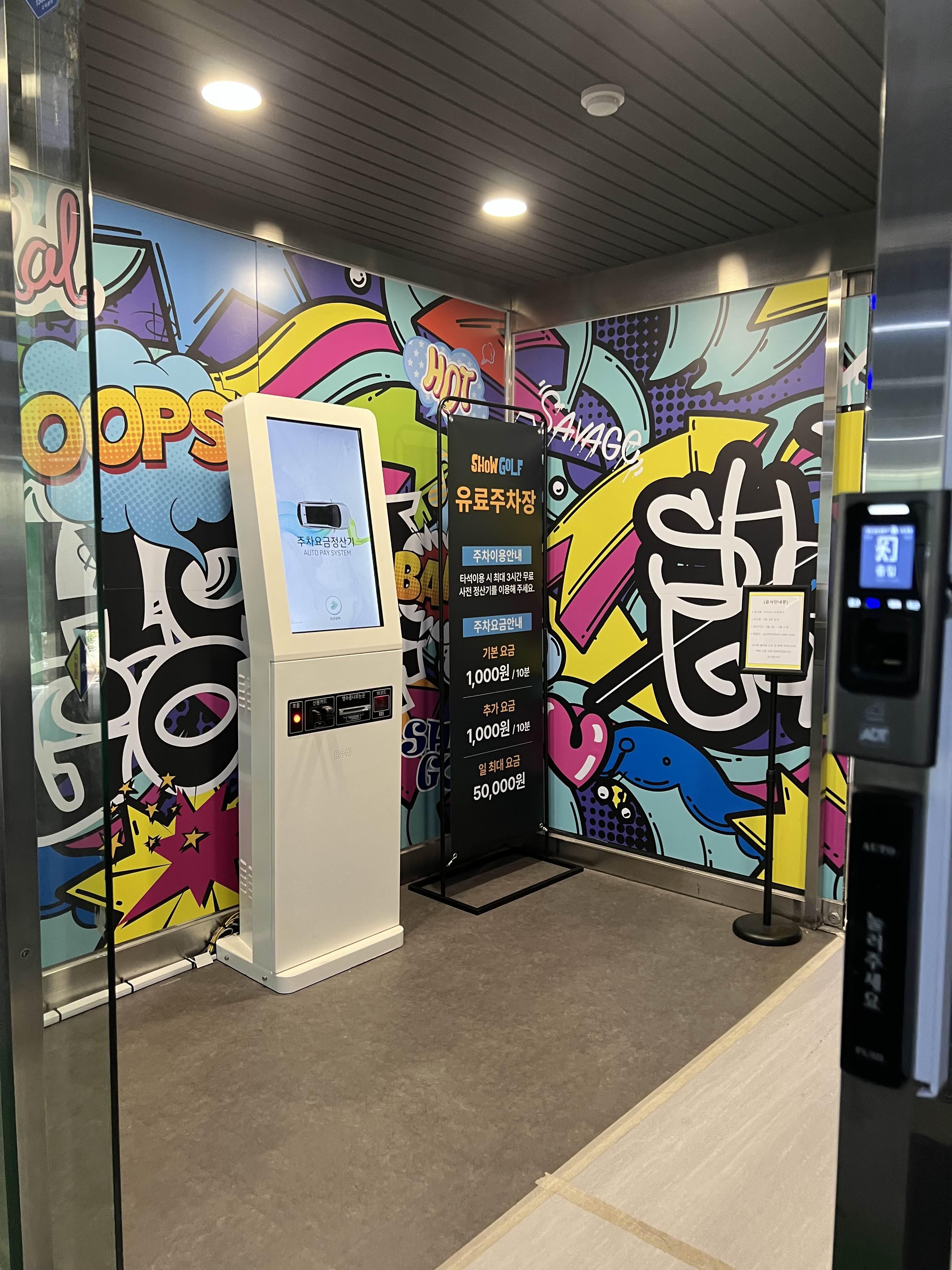 주차장 입구에는 곧 프렌즈 골프도 입점을 한다는 안내 문구와 출입구에 주차비 결제하는 시스템도 보인다.