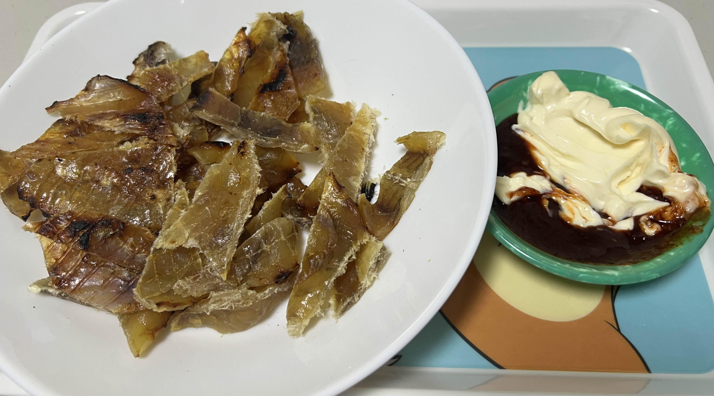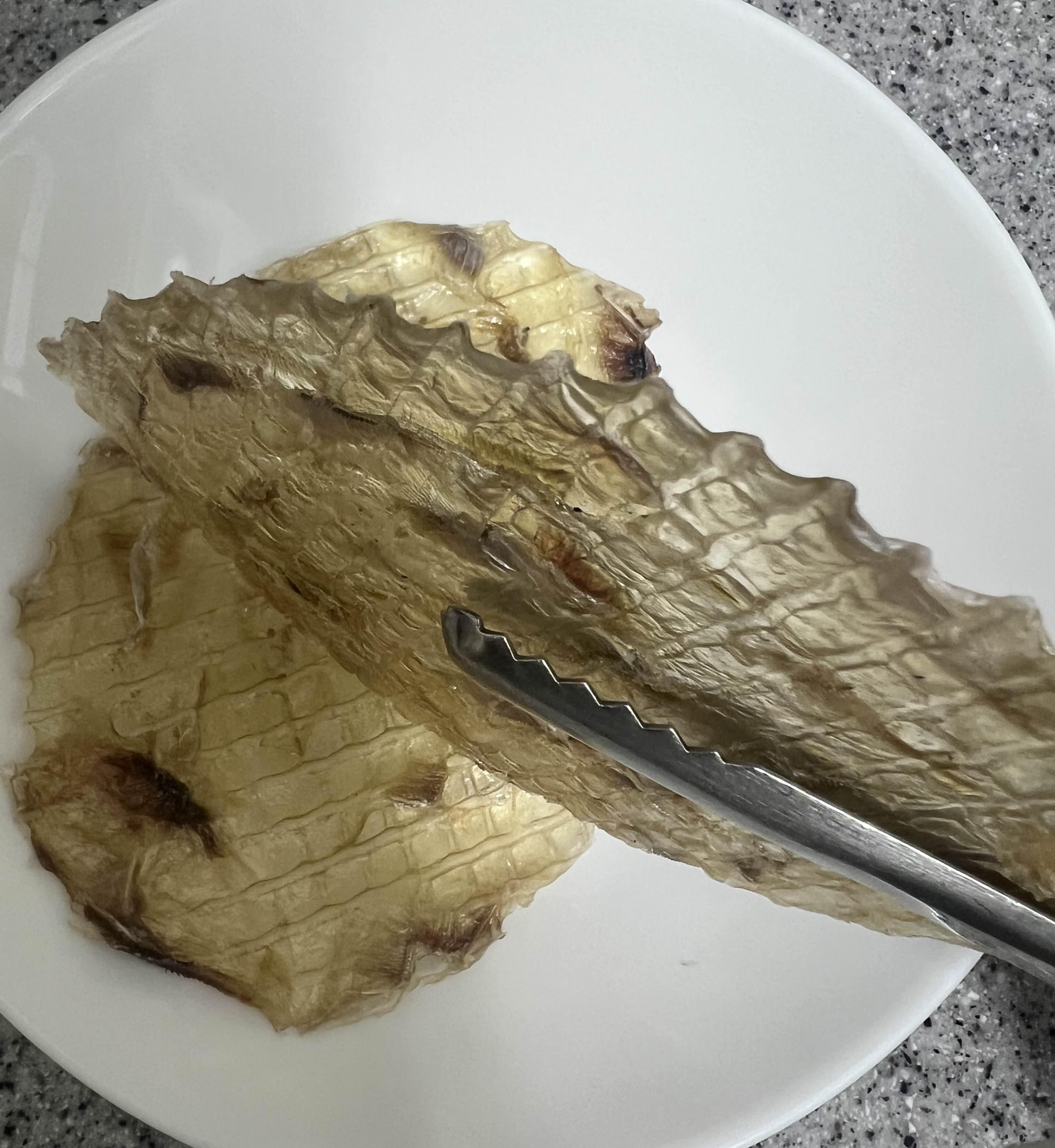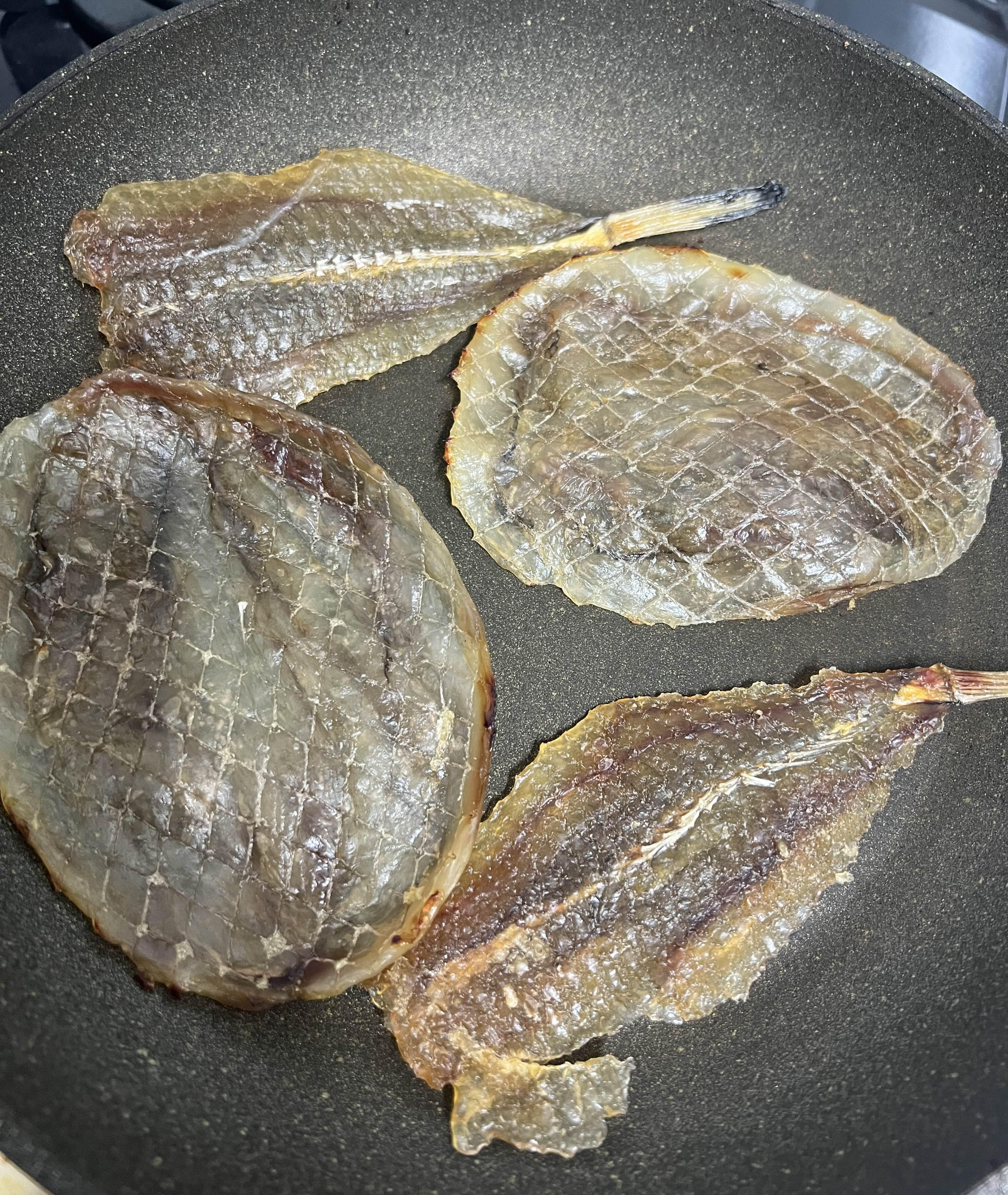 종류별로 프라이팬에 구워보았다. 왼쪽놈이 아귀포(살짝두꺼움) 오른쪽이 쥐포 (얇음), 꼬리달린게 아귀꼬리