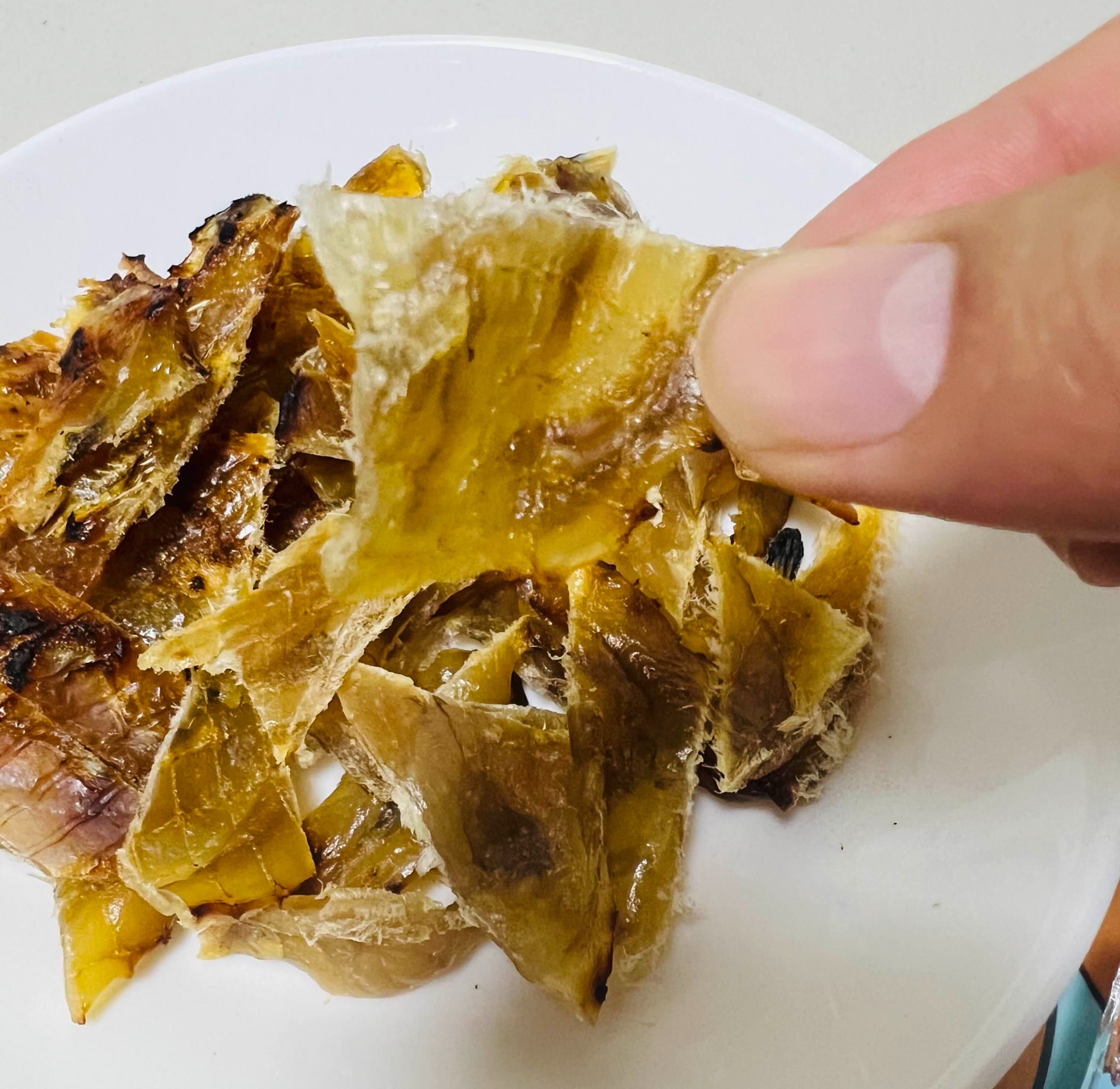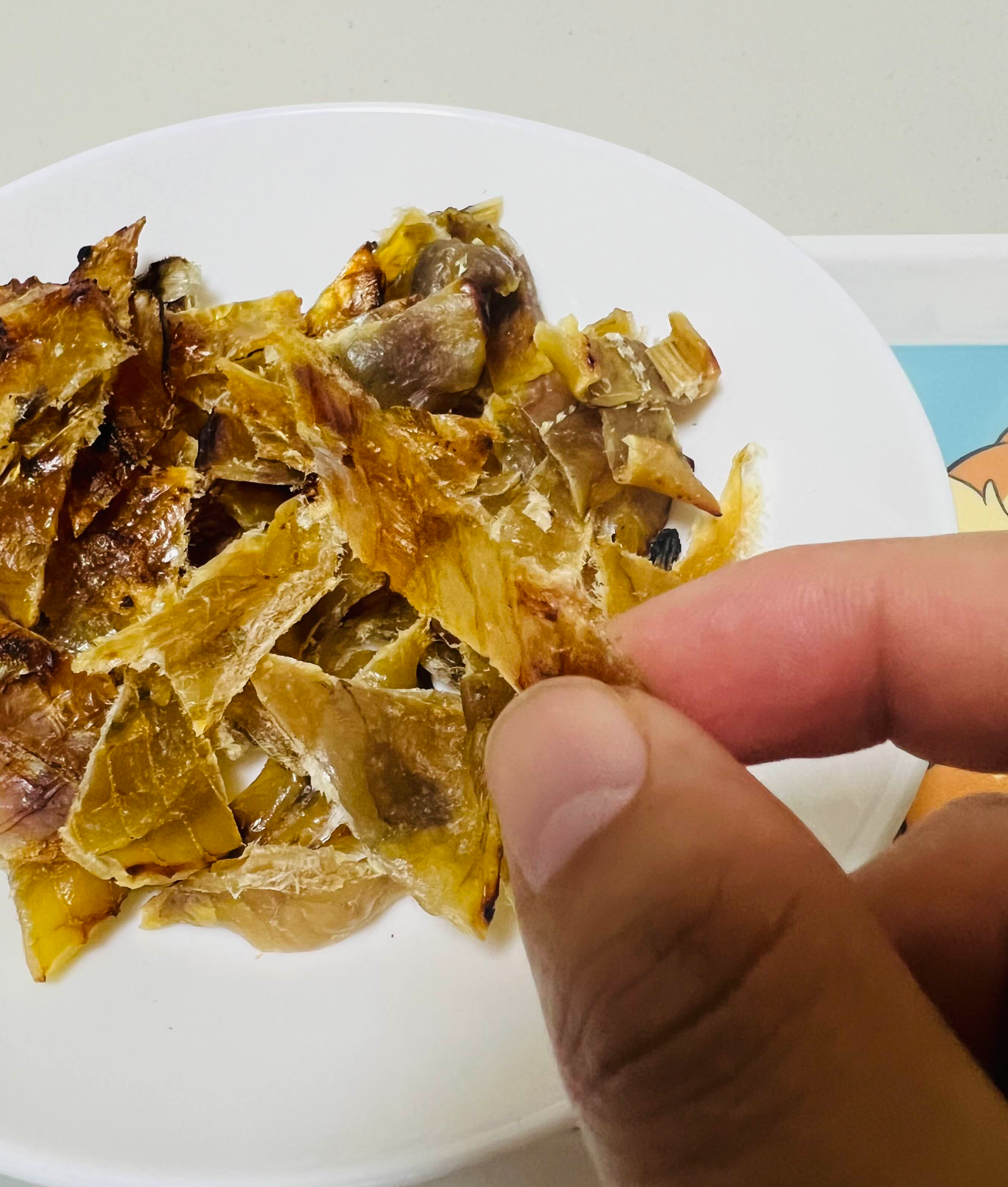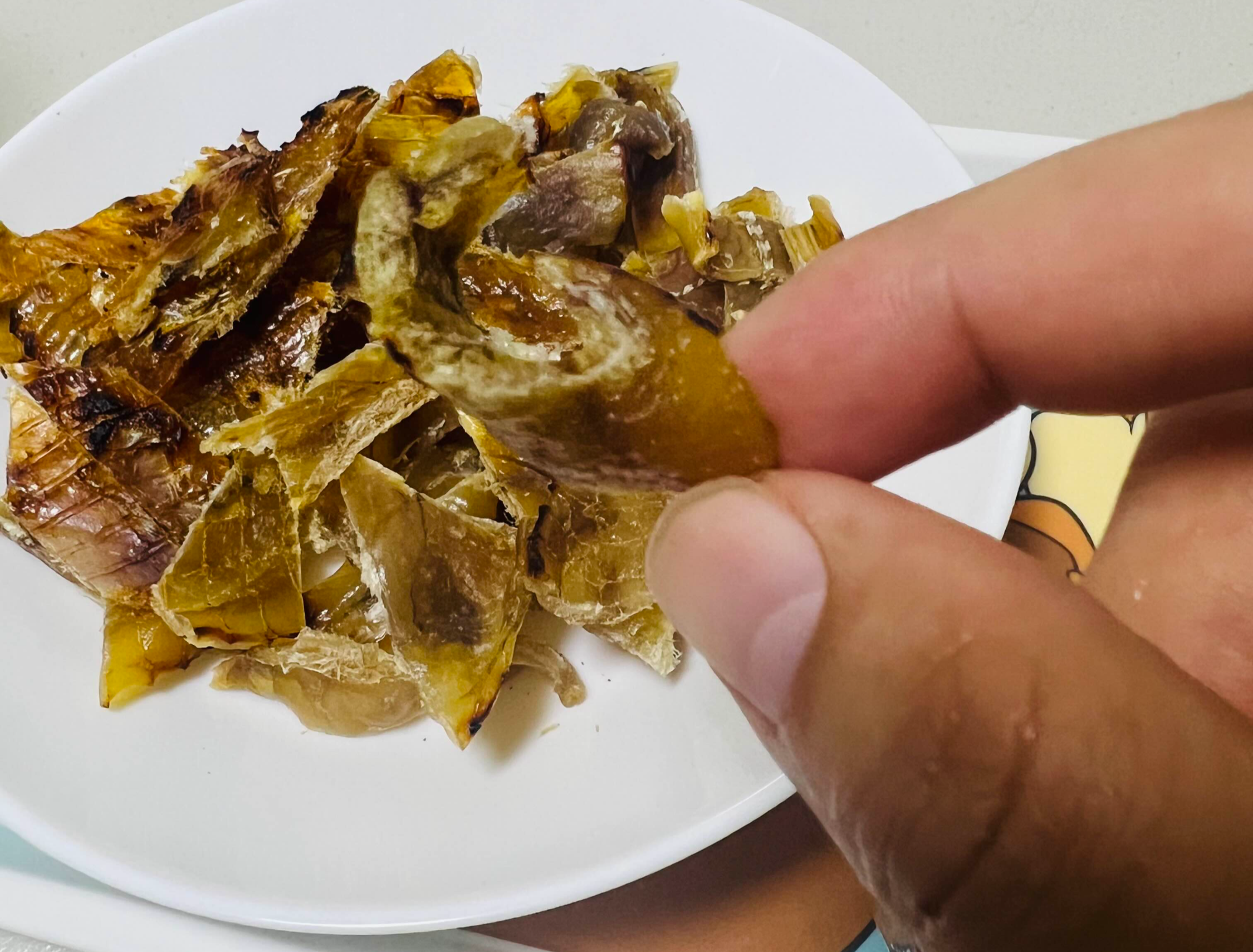종류별로 프라이팬에 구워보았다. 왼쪽놈이 아귀포(살짝두꺼움) 오른쪽이 쥐포 (얇음), 꼬리달린게 아귀꼬리