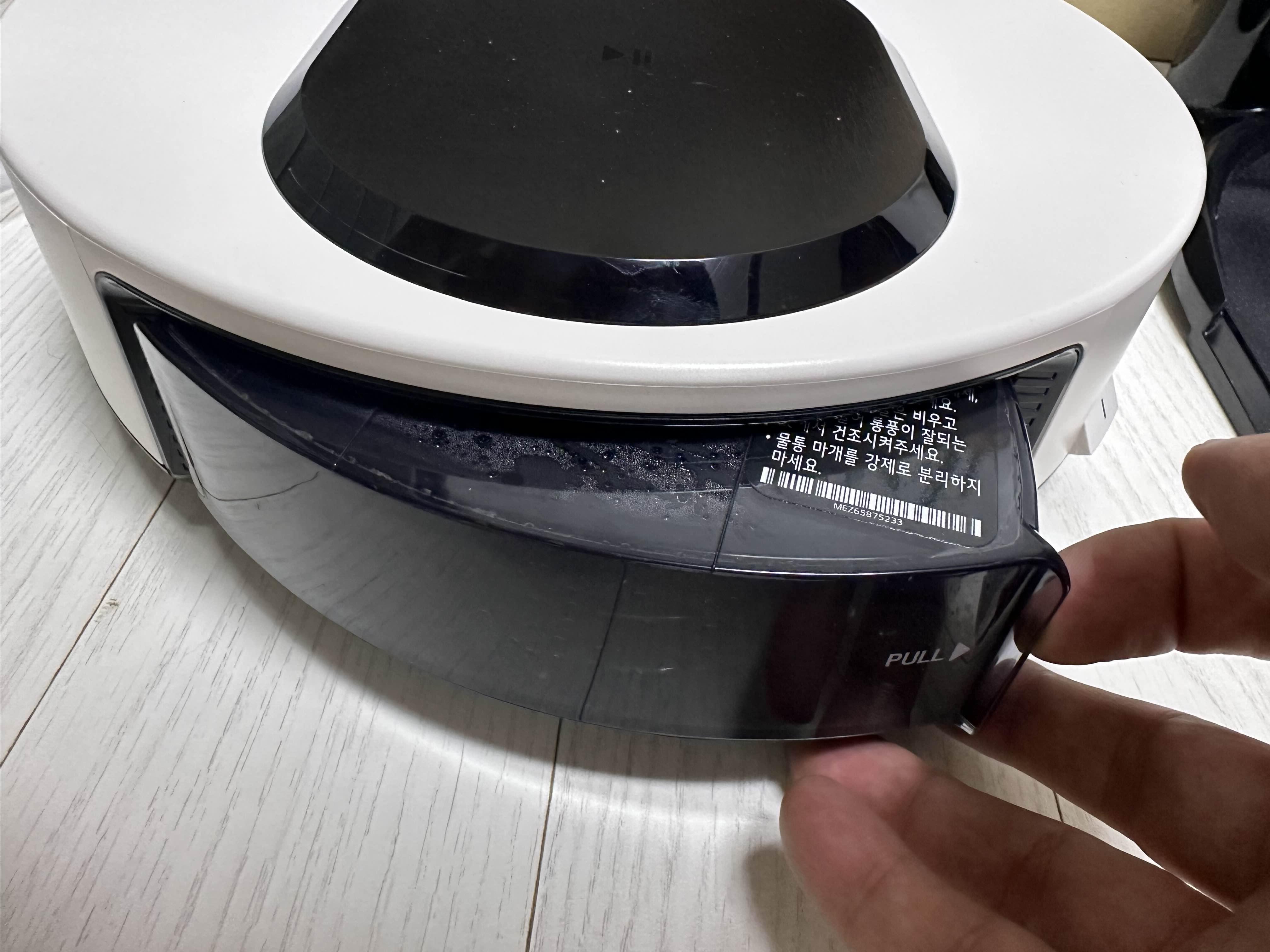 물걸레 청소기이다 보니 물통이 달려있는데, 아래쪽에 달려있고 표기된 PULL 손잡이를 살짝 당기면 나온다.
