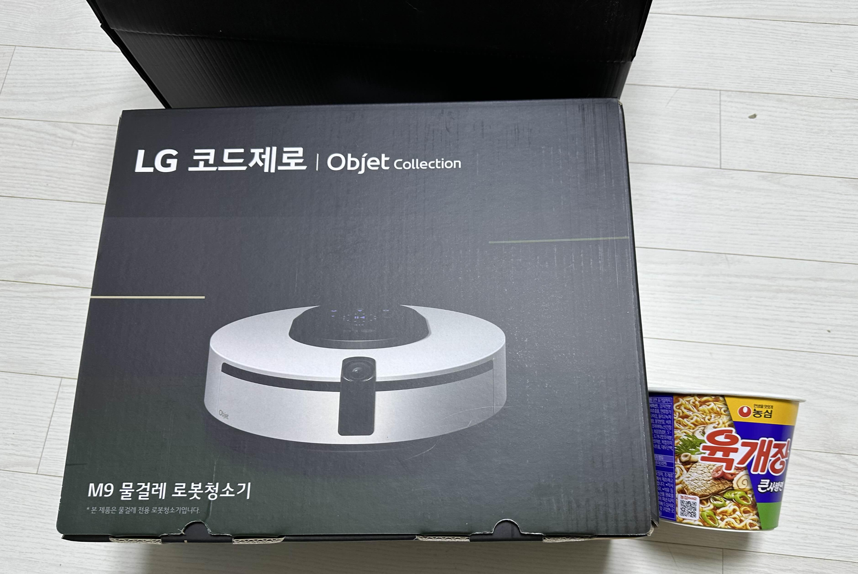 로봇 LG M9 의 박스크기는 육개장 큰사발로 비교해 보았을 때 대략 육개장 큰사발 9개 정도 크기라 할 수 있겠다.